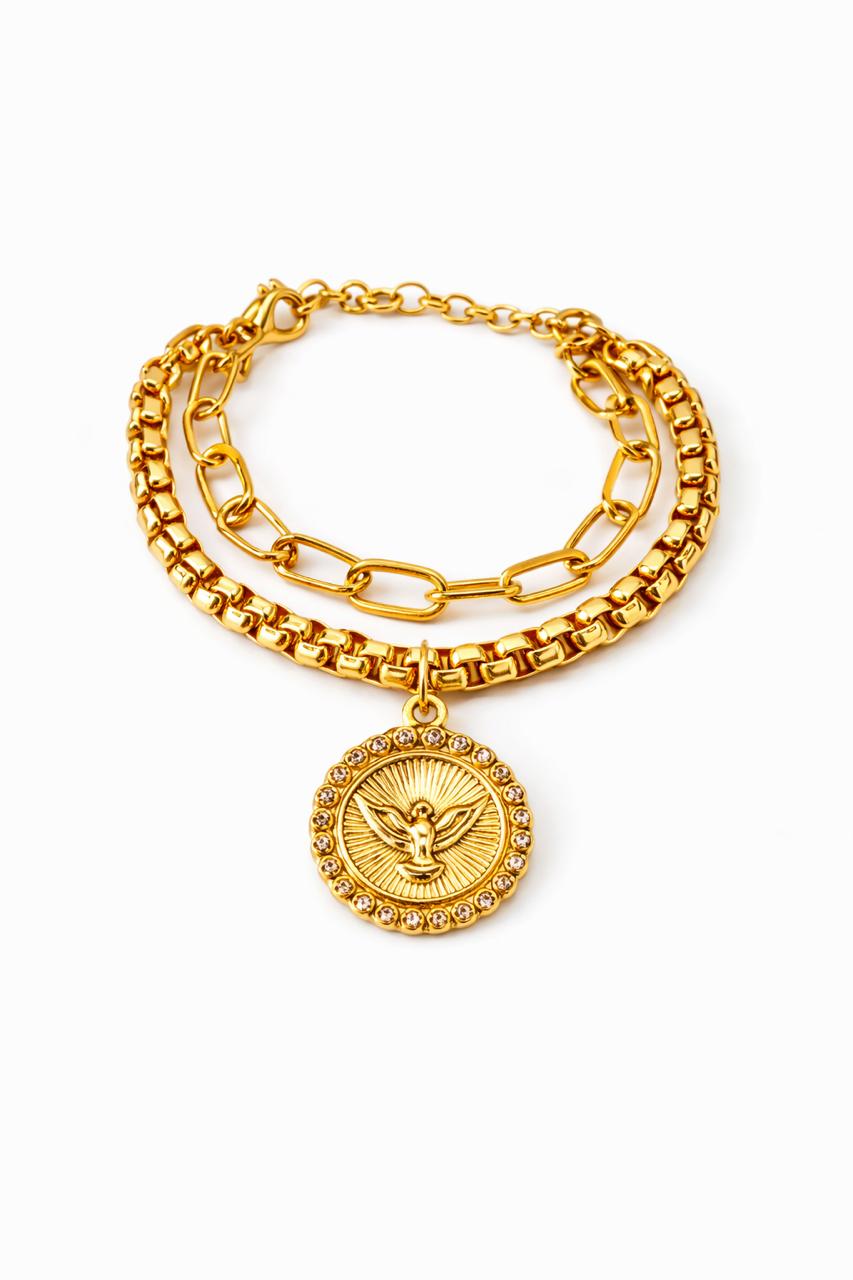 Pulseira elegante com mix de correntes e pingente de medalha com o símbolo do Espírito Santo, representando fé e proteção. Seu design moderno combina diferentes estilos de correntes, trazendo um visual sofisticado e atual. Disponível nas cores prata e dourado, é ideal para compor looks cheios de significado.